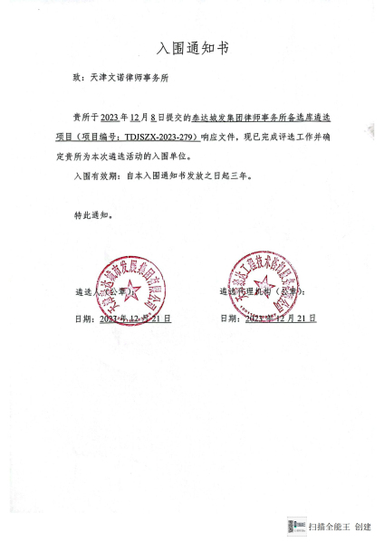 近日,天津文诺律师事务所凭借在相关领域的专业技能和丰富经验,成功入围“泰达城发集团律师事务所备选库遴选项目”,有效期3年。本次入库,将由天津文诺律师事务所时岩、李晨、刘雪、杨奕智、孙宪、刘子琪6名律师组成专业的法律服务团队,运用丰富的专业知识和法律服务经验,为“天津泰达城市发展集团有限公司”提供高效、优质、全面的法律服务。
